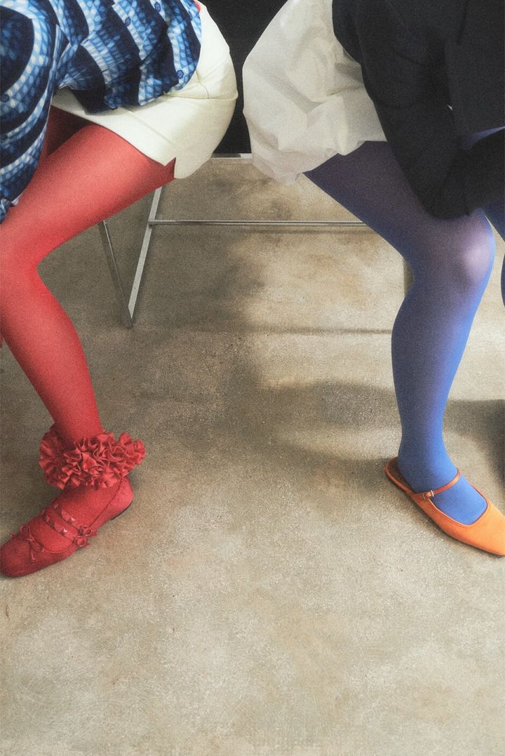left - skirt by ZARA, shoes and headdresses wear as leg warmers by MANGO, vintage shirt, tights, earrings and necklace stylist’s own,right - top, skirt and shoes by ZARA, jacket, vintage tights, earrings and necklace stylist’s own