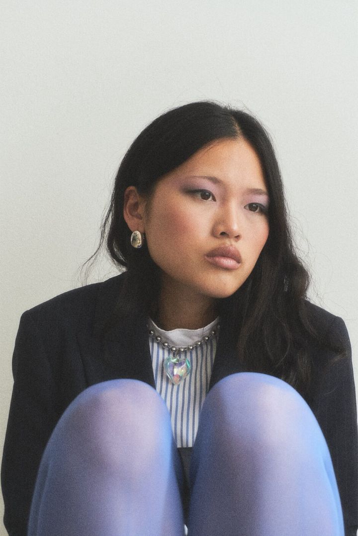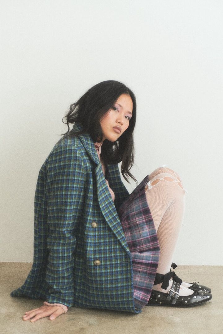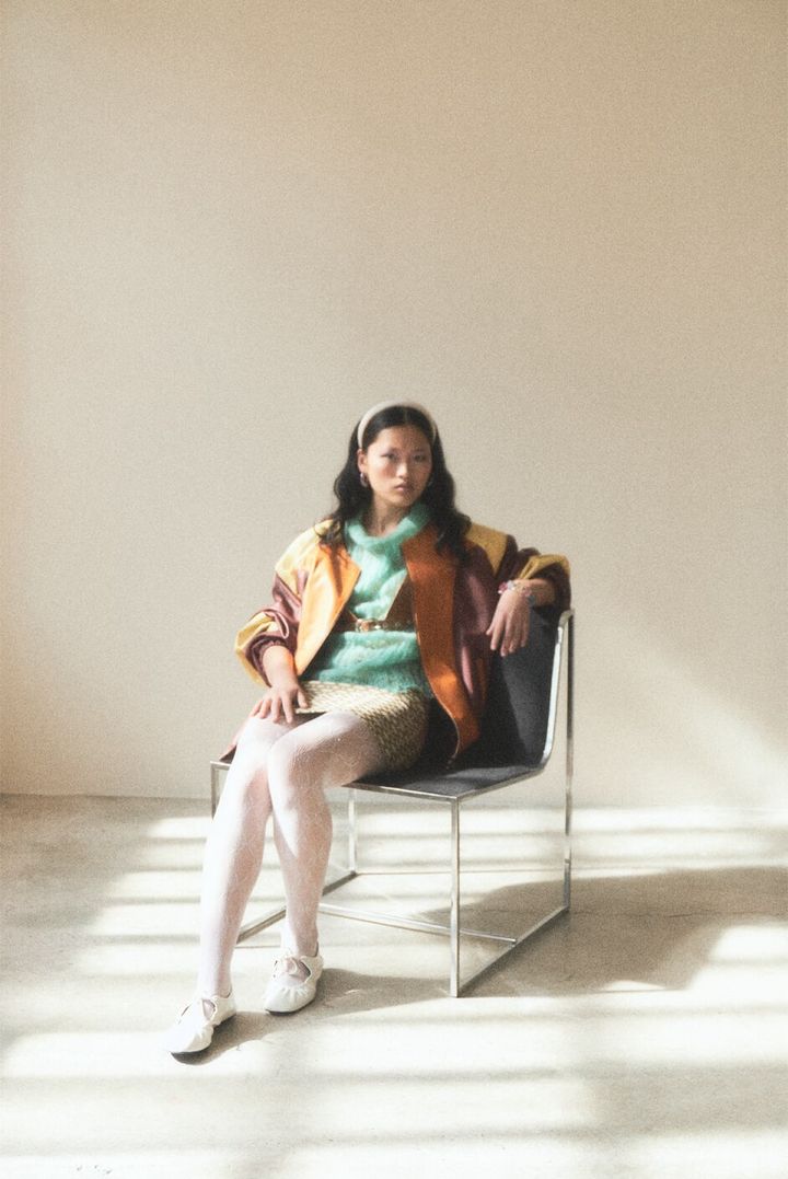 jacket, bra and top by MAPI, skirt by & OTHER STORIES, shoes by PULL&BEAR, tights, headdress, earrings and bracelet stylist’s own