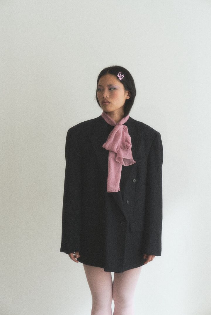 top by NICOLE DE SEMIR, shorts by MANGO, shoes by ZARA, headdresses wear as arm warmers by URBAN OUTFITTERS, tie by MAPI, vintage jacket and socks stylist’s own