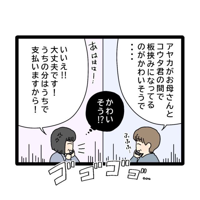 アヤカさんが選んだベビー用品を購入するにあたり、コウタさんと折半した不足分をアヤカさんのお母さんが支払うと申し出ました。義母にそのことを直接伝えたのですが、「コウタ君がお母さんに相談して許可を得ないとって話しているのを聞いたらかわいそうになっちゃって。」と言われた義母は心穏やかではありません。