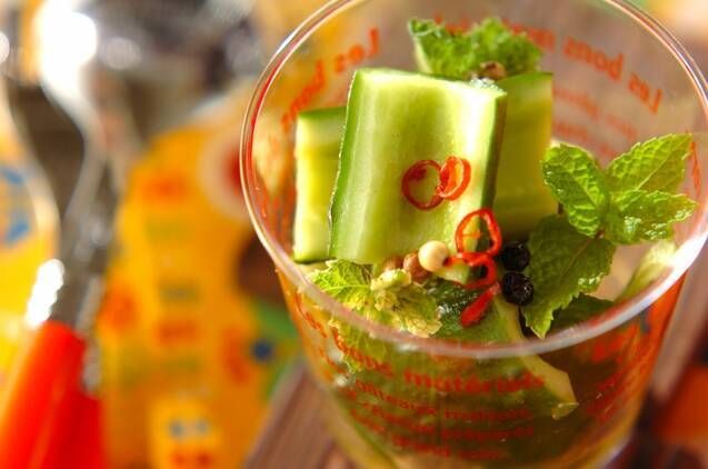 小さなキューブ形に切ったキュウリやニンジンなどの野菜を、オリーブオイルと梅干しで和えた一品は、口当たりさっぱりで箸がすすみます。冷蔵庫でキンキンに冷やして食べてください。