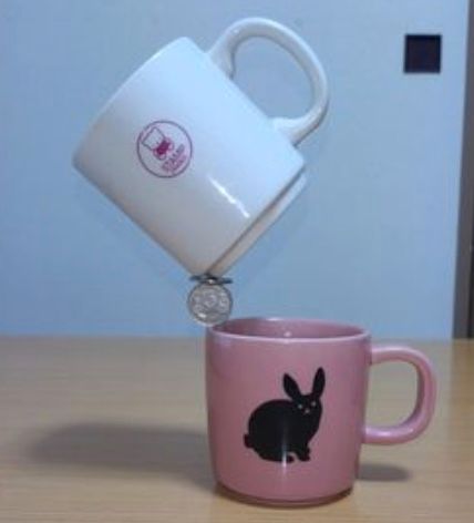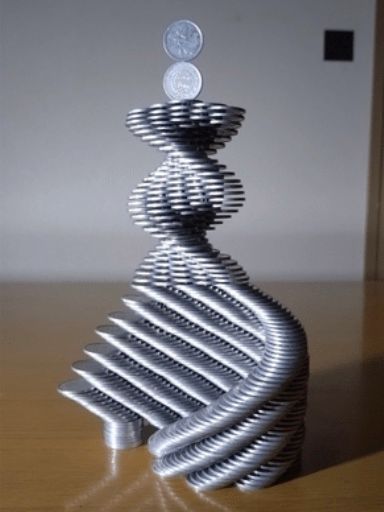 ワイングラス、ピンセットなど、普段使うアイテムが何層にも積み重ねられたバランスアート。しかも、ビンの中とワイングラスの下のコインは、立っています!