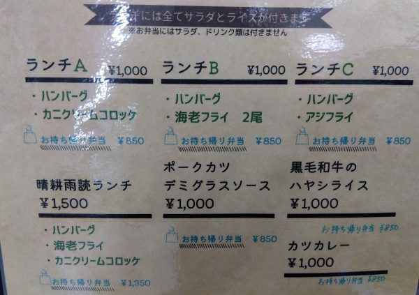 ランチメニューは、ハンバーグとカニクリームコロッケのランチA(1000円)、ハンバーグとエビフライ2尾のランチB(1000円)、ハンバーグとアジフライのランチC(1000円)、ハンバーグとエビフライとカニクリームコロッケの晴耕雨読ランチ(1500円)、ポークカツ デミグラスソース(1000円)、黒毛和牛のハヤシライス(1000円)、カツカレー(1000円)、本日のスペシャルランチ(日替わりランチ・950円)。全てのランチには、彩りサラダとライスが付きます。