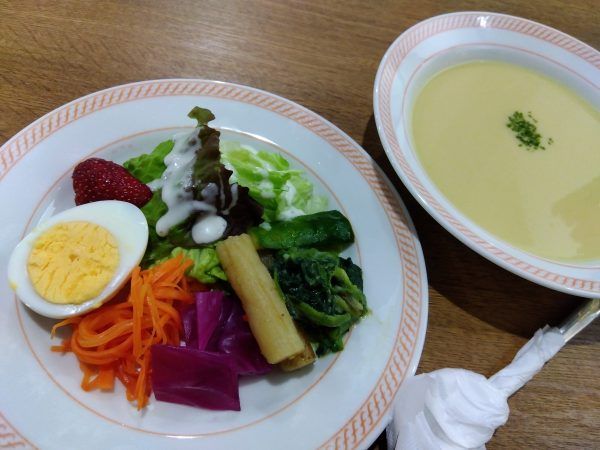 全てのランチに付く、彩りサラダ。この日は、スープサービスも。 全てのランチに付く、彩りサラダのボリュームにビックリ!! 生野菜、お浸し、酢漬け、ゆで卵、フルーツとお皿いっぱいなのがウレシイ~。この日は、スープのサービスも。この日のスープは、たっぷりのコーンスープでしたよ。