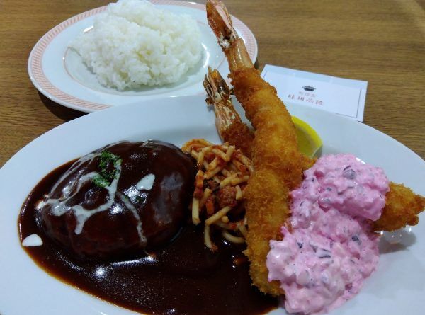 ハンバーグとエビフライ2尾のランチB(1000円) 人気No.1のランチBをいただきました。ピンクのタルタルソースが食欲をそそりますね。これは、柴漬け入りのタルタルソースなんですよ。カリッと揚がった大きなエビフライが2尾も!! そして、デミグラスソースに包まれたハンバーグ。挟まれたミートソーススパゲティーもいい味を出していましたよ。オイシイ~。ライスは普通盛りにしましたが、なかなかの量。大盛にもできるそうですよ。コスパ抜群ですよね!!