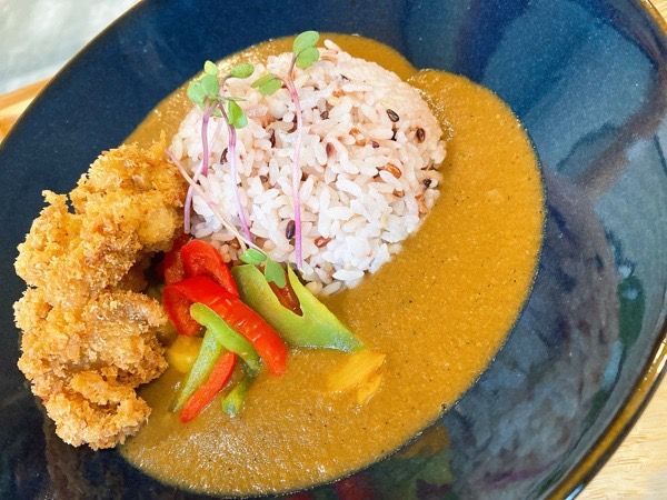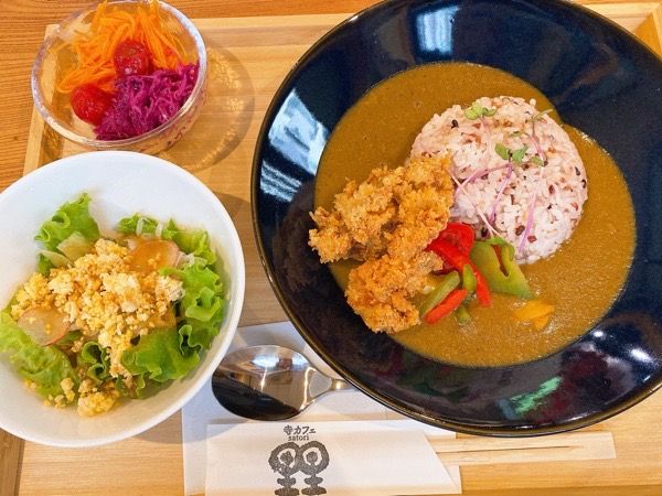 まず、「お米がおいしい!! 」十六穀米使用!お米のひと粒ひと粒の存在感があってもっちもち!パプリカは炒めて甘みがしっかり出ている。ひと口食べれば口の中に甘みが広がるのだけれど、徐々に辛みが追ってくる。スパイスとショウガが効いており、辛すぎないから食べやすい!ほんのりピリッとした感覚がクセになる。 そこで!カラフルなピクルスへ手を伸ばす。 トマト、紫キャベツ、ニンジン。お酢の主張が激しすぎず、お口直しにめちゃくちゃサッパリ!カレー♪ピクルス♪カレー...と、エンドレスで食べれちゃう!(笑) 書き損じるところでしたが、チキンが、、、!これまた珍しい食感で?どうやら米油で揚げているようです。油を変えるだけでこんなに食感が変わるものかと。サックサクジューシーでカレーにめっちゃ合う!! え、満足感高すぎランチでした☆