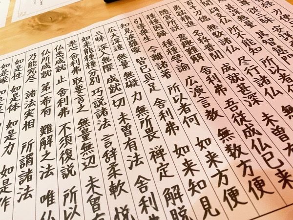 一番最後に願い事を自由に書く欄があり、そこで少し筆が止まりました。 「私はいま何を叶えたいのか?」 書き上げた写経はお隣の法得寺でお預かりしていただき、お勤め時にお経をあげて祈願してくださいます。第2日曜日のお勤め時に一緒に参加することも可能なようです。 いや〜、なかなか非日常体験をさせていただきました!