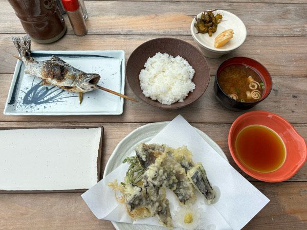 おすすめ商品に弱い。注文した桜マス塩焼き(650円)とイワナてんぷら定食(1600円)です。 天ぷらにはイワナ、まいたけ、せり、なすといった種類でした。