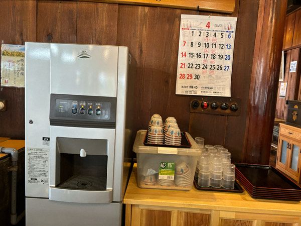 お茶と水はセルフサービス。レジの前付近に給湯器が置いてありました。