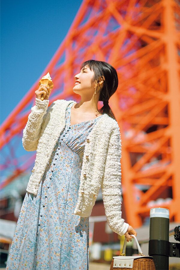 ワンピース¥17,600/ココ ディール バッグ¥24,200/ヴィオラドーロ(ピーチ) 靴¥17,600/プラス ダイアナ(ダイアナ 原宿店)