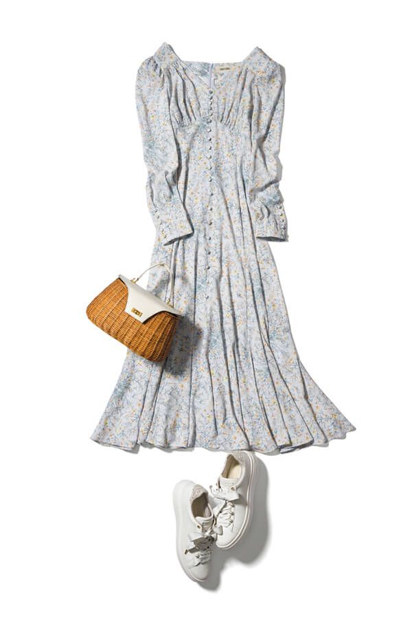 朝の身支度をサッと済ませたいスケジュールの日は、 1枚で着映え度抜群なワンピを頼って。優しげな印象のボタニカルな花柄なら、親しみやすい印象でお店の人たちとの会話も弾みそう♪ バッグは軽やかに持てるカゴ素材が、ラフな足元とも好バランス。