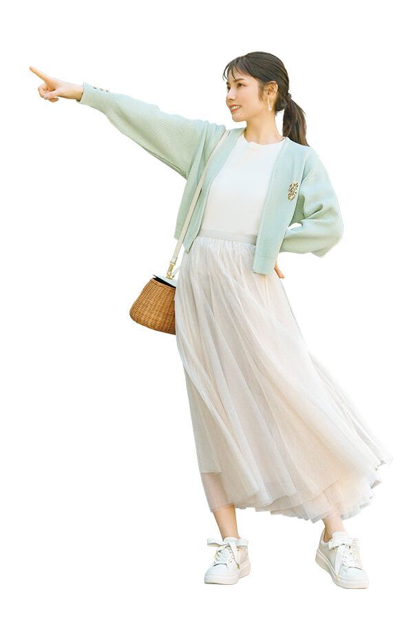 透けるチュールの重なりが美しいスカートは、空気を含むような揺れ感が優雅。ミント色カーデを添えてさわやかに着こなせば、すがすがしい北海道でひときわ着映え♡