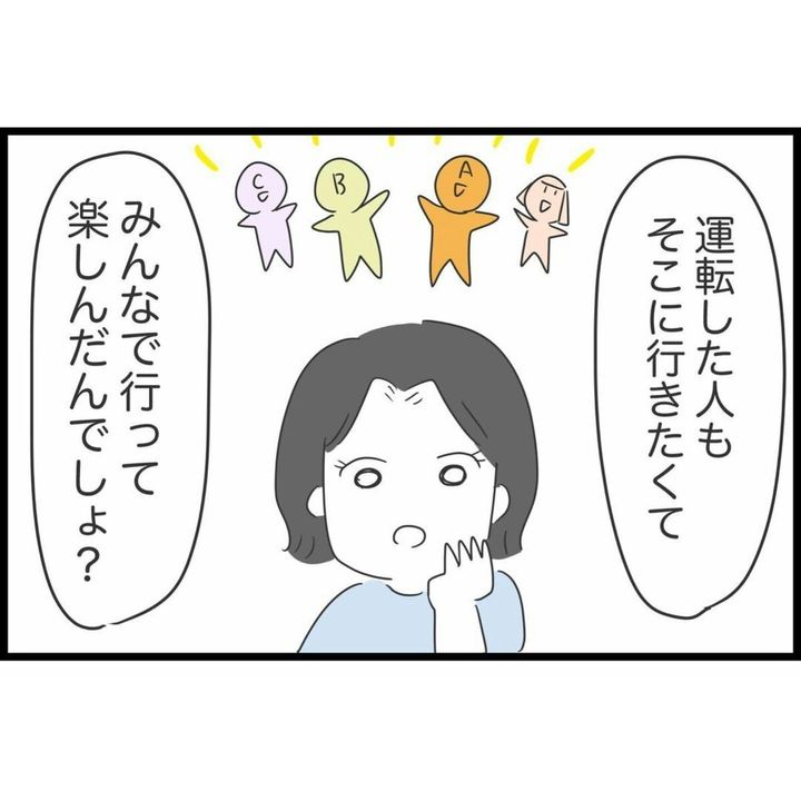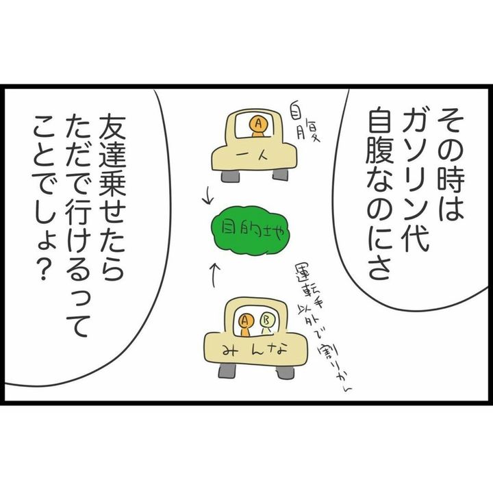 別の友人・ゆっきーは「運転する人が行きたかった場所に友だちと一緒に行ったら、ガソリン代がタダになるのはずるい!」と自論を展開しはじめました。これがゆっきーの価値観なのかもしれませんが、いつも運転してくれるすみれさんの前で言うのは配慮がないかもしれませんね…。