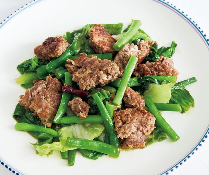 ひき肉はパックから直接フライパンに投入し、焼きつけてから一口大に切り分けます。こうすることでそぼろ状に炒めるよりも食べごたえのある一皿に。