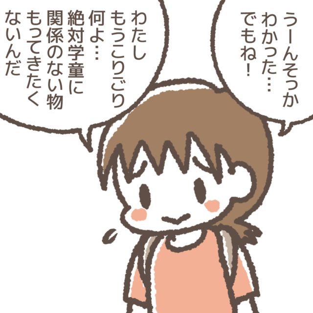 「うーんそっか、わかった・・・でもね!私もうこりごりなんよ・・・絶対学童に関係のない物もってきたくないんだ」