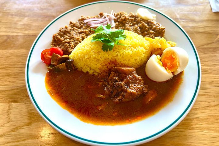 チキンカリー、ポークビンダルーカリー、ラムキーマカリー、それらの組み合わせで2種(チキンとポークビンダルーか、チキンとラムキーマか)と、3種全部のあいがけが選べる。チキンティッカプレートもあるが、日曜日のみということで今回は断念した。辛さを聞くとラム、チキン、ポークの順に辛いとのことなので、辛めのふたつ、チキンとラムキーマのあいがけに、トッピングとして茹で玉子を選んだ。根拠はないのだが、辛いとはいえ、お店の優しい雰囲気と味がリンクしていると思っての選択だった。