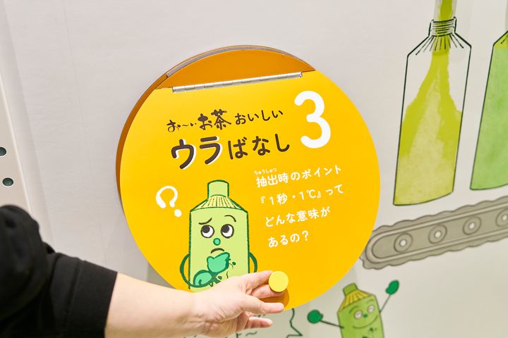 茶畑から「お~いお茶」ができるまでを伝えるコーナーでは、おいしさの秘密をイラストや映像で紹介。クイズ形式になったパネルを見たり、ハンドルを回してお茶作りの工程を確認することもできます。
