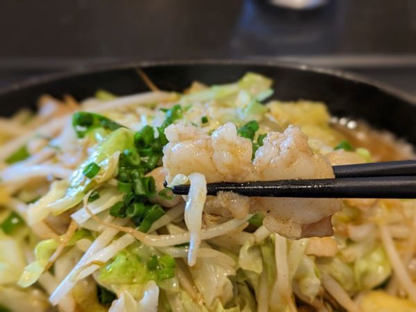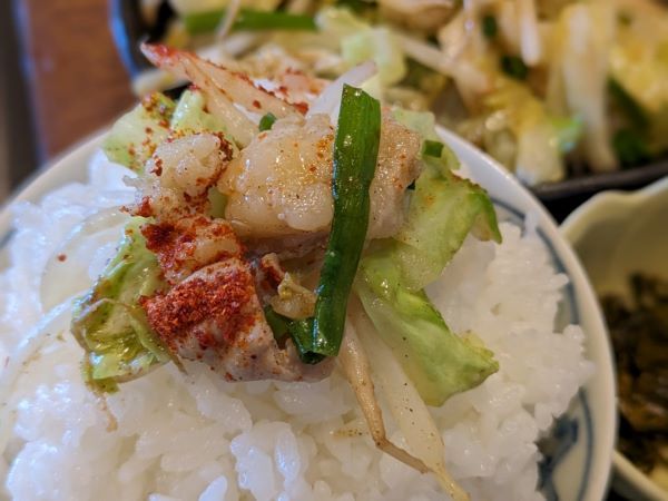 ふんわり柔らかく、噛むとプッリプリでお肉の甘みがお口に広がります。嫌な脂っぽさが全然ない上に、家庭的な優しい味つけでちょうどよい塩加減です。メニュー表に「甘辛みそ味」と書いてあったので、男子学生向けの一口で何杯もご飯がいける濃い味を想像していたのですが(笑)、いい意味で裏切られました。キャベツともやしも、シャキシャキ加減がプロの技で、最高に美味しいです。 一味をかけると、ちょっとパンチが効いて、ご飯大盛もなんのそので(笑)、飽きずにあっという間に完食しました。因みに、もつは、調理師のオーナーさん(夜担当)が厳選した、しま腸もつ肉で、加熱しても脂が溶けずにふっくら感が残るので、もつ鍋にも最適なこだわりのお肉なのだそうです。