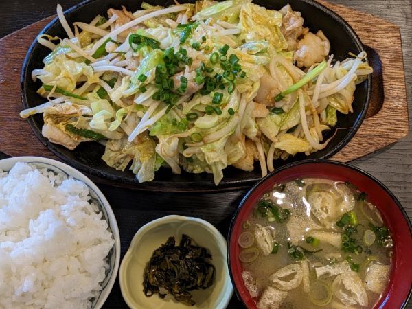 外に紹介されていた5種類よりも、さらに1つ種類が多くて、かなり迷います。どれもこれも美味しそうなのに、なんと定食のお値段は、全て税込み690円なんですよ~!メインはお肉とお野菜の組み合わせが多くて、栄養バランスが良さそうですし、どの定食にもお漬物とお味噌汁がついて、ごはん大盛無料という、正に”神定食”! 男子学生さんに人気なのは「ホルモン鉄板焼き定食」、女性に人気なのは「チキン南蛮定食」とのことでしたが、お伺いしておきながら心の声に従って(笑)、前者の定食をいただいてみることにしました。ジュージュー聞こえてくる音にテンションが高まったところで、到着です。