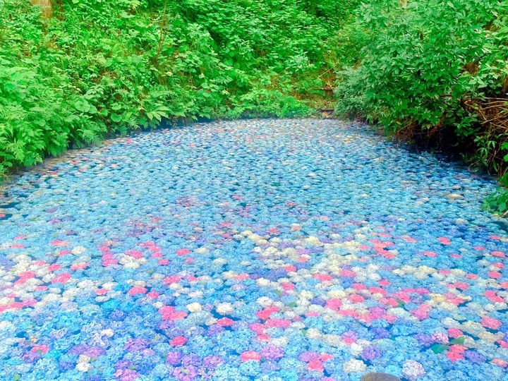 色とりどりの紫陽花の切り花がギッシリと池に浮かべられており、まさに映え!