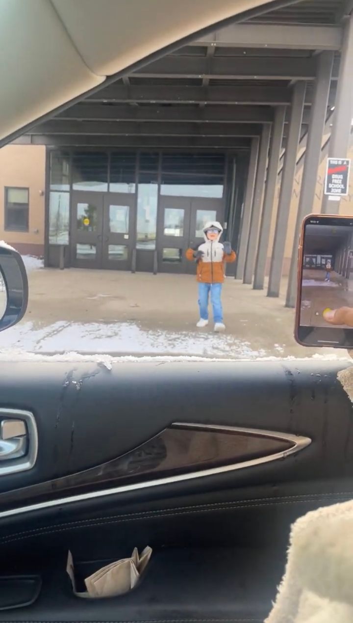 学校の前まで車で送迎してもらった男の子は、両親から「楽しんでおいで!」と明るく送り出されて登校していきました。