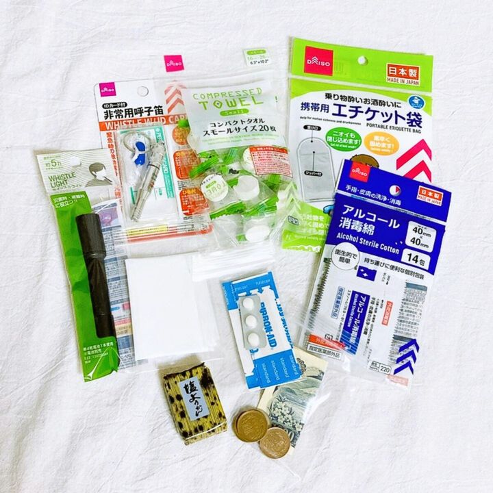 現金と常備薬は自宅にあるものを使い、そのほかは合わせて1,000円程度で用意。購入される店舗にもよると思いますが、どの商品も比較的すぐ手に入ります。