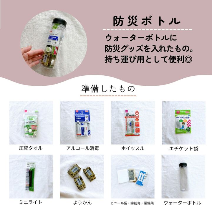 今回はダイソー商品で作る「防災ボトル」をご紹介しました。
