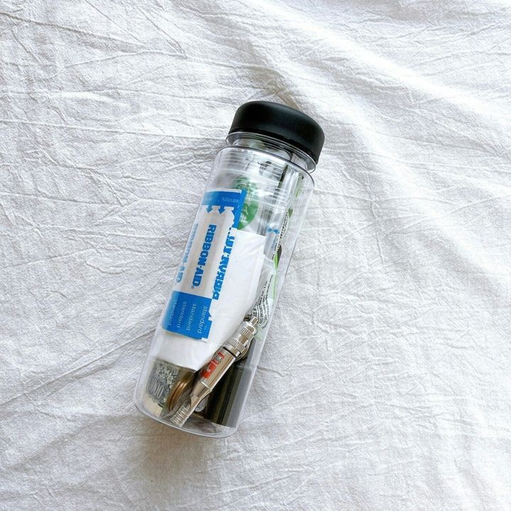 防災グッズをウォーターボトルに詰め込んで、いざというときのために備えておくだけでも心強いですよね。ダイソーで1つ100円ほどで購入でき、まとめてそろえても1,000円程度で済むので気軽に用意ができます。