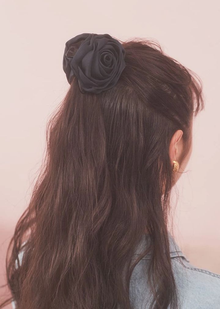 ①でまとめた上半分の髪を結んでハーフアップにする。正面から見たときに、あとからつけるヘアクリップがちらっと見える高め位置で結んでおく。バラのヘアクリップを、結び目の上からつける。
