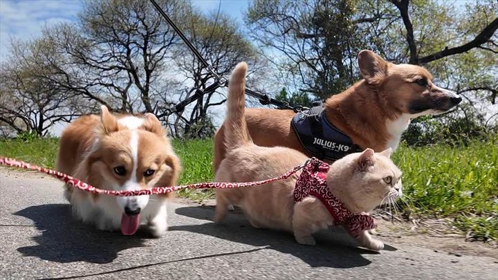 ご紹介するのは、コーギーの兄妹と猫と暮らしているちいむうととろ(@muchi21067312)さんがXに投稿された写真です。 みんなでおさんぽに出た時のワンシーンを捉えたその写真には・・・