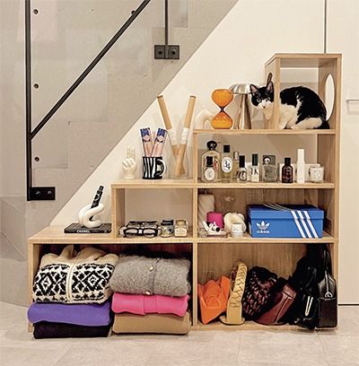 「メゾネットで少し変わった間取りの部屋なので、大きな家具は置かずキャットウォークも兼ねる収納棚を利用して、香水やアクセサリーなど使う頻度の高いものを収納。偶然にも階段下のスペースにぴったり! 毎日使うアイテムをすぐにとれて、お気に入りがいつも目に入るので気分も上がります。猫もかなり気に入っている様子で、よくここでくつろいでいます」(hitomiさん・PR)@__hitocchi