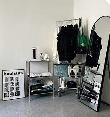 「洋服収納が少なく、クローゼット内にニットをたたんで置くスペースがなかったためラックとシェルフを並べてショップ風に収納。洋服を選びやすく、季節によって並ぶ洋服が変わるのも好きで、1年を通して「見せる」インテリアに。洋服に合わせて壁面のディスプレイを変えながら空間づくりを楽しんでいます」(minamiさん・ANNE HOUSEHOLD GOODSデザイナー) @mnmii___