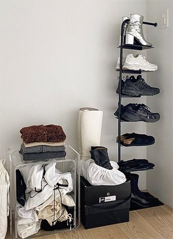 「シューズボックスがない部屋なので、縦型に置けるシューズラックを購入し思いきってディスプレイ収納に。よく履く靴を置いてコーディネートが組みやすいように。ラック横にもブーツやサンダル、バッグなどを巾着や箱に入れて無造作に積み上げていますが、モノトーンにまとめているのですっきり見え。収納のなさをプラスにとらえてむしろインテリアっぽく」(chika kitamiさん・会社員)@chikalata