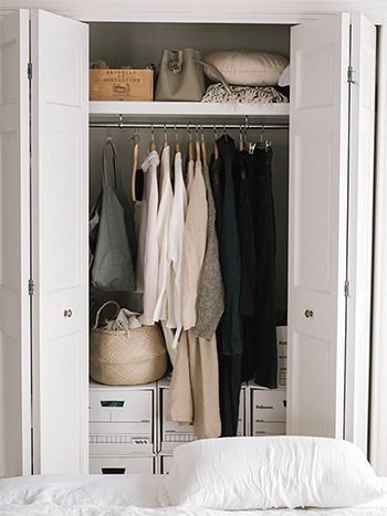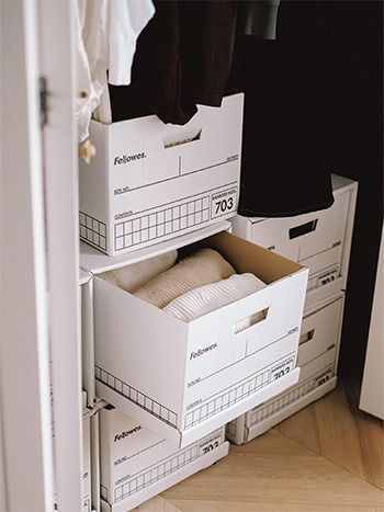 クローゼットを開けたときにもすっきりして見えるように、グラデーションに並べています。全体のまとまりを出すために、ハンガーはIKEAの木製のもので統一。色順に並んでいることで、服も選びやすく気に入っています。着る頻度の低いニットは、見た目もかわいいフェローズのバンカーズボックスに入れて保管。(菅野有希子さん/プロップスタイリスト)
