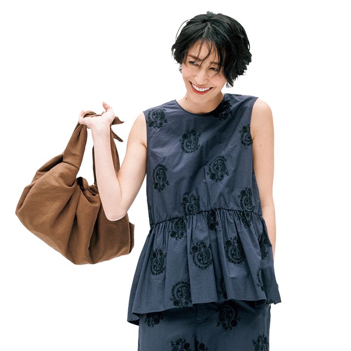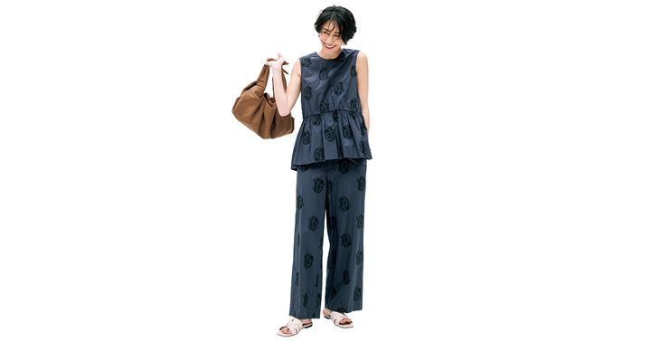 刺繍トップス¥24,200 刺繍パンツ¥28,600(ともにヌキテパ/パサンド バイ ヌキテパ)イヤリング¥16,800(アビステ)バッグ¥26,400(パピルス × デミルクス ビームス/デミルクス ビームス 新宿)サンダル¥37,400(ファビオ ルスコーニ/ファビオ ルスコーニ ルミネ有楽町店)