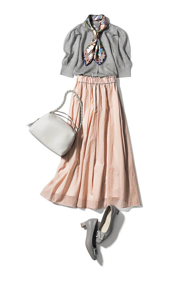 スカートの色みとリンクする柄スカーフを首に巻き、エレガントな雰囲気を演出。ブラウスや小物をグレー系で合わせて上級見えを狙って。