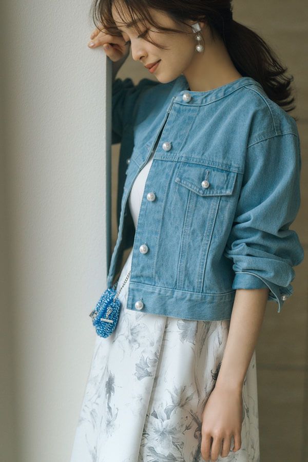 パールボタン&ノーカラーでデニムジャケットを女っぽ仕様に
