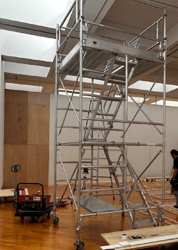 高さ約4mのローリングタワー。展示作業のいろんなシーンで登場するすごいヤツ