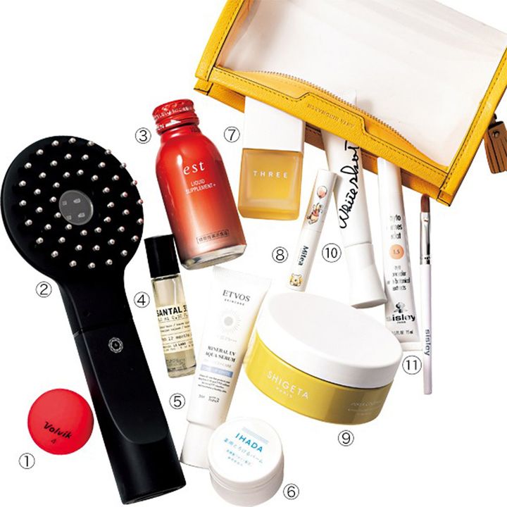 「①②ゴルフボールとデンキバリブラシで全身のむくみをオフ。③エストのドリンクは飲むと熟睡できます。④シゲタのバスソルトでバスタイムにデトックス、⑦のTHREEのオイルでマッサージを。⑥イハダのクリアバームは全身に使えます。⑤エトヴォスは下地と日焼け止めを兼用。⑧のミティア オーガニックのリップはほんのり色づきます。⑩ポーラのホワイトショットで日差しを浴びたらすぐにケア。⑪のシスレーのコンシーラーはファンデ代わりになるので便利」