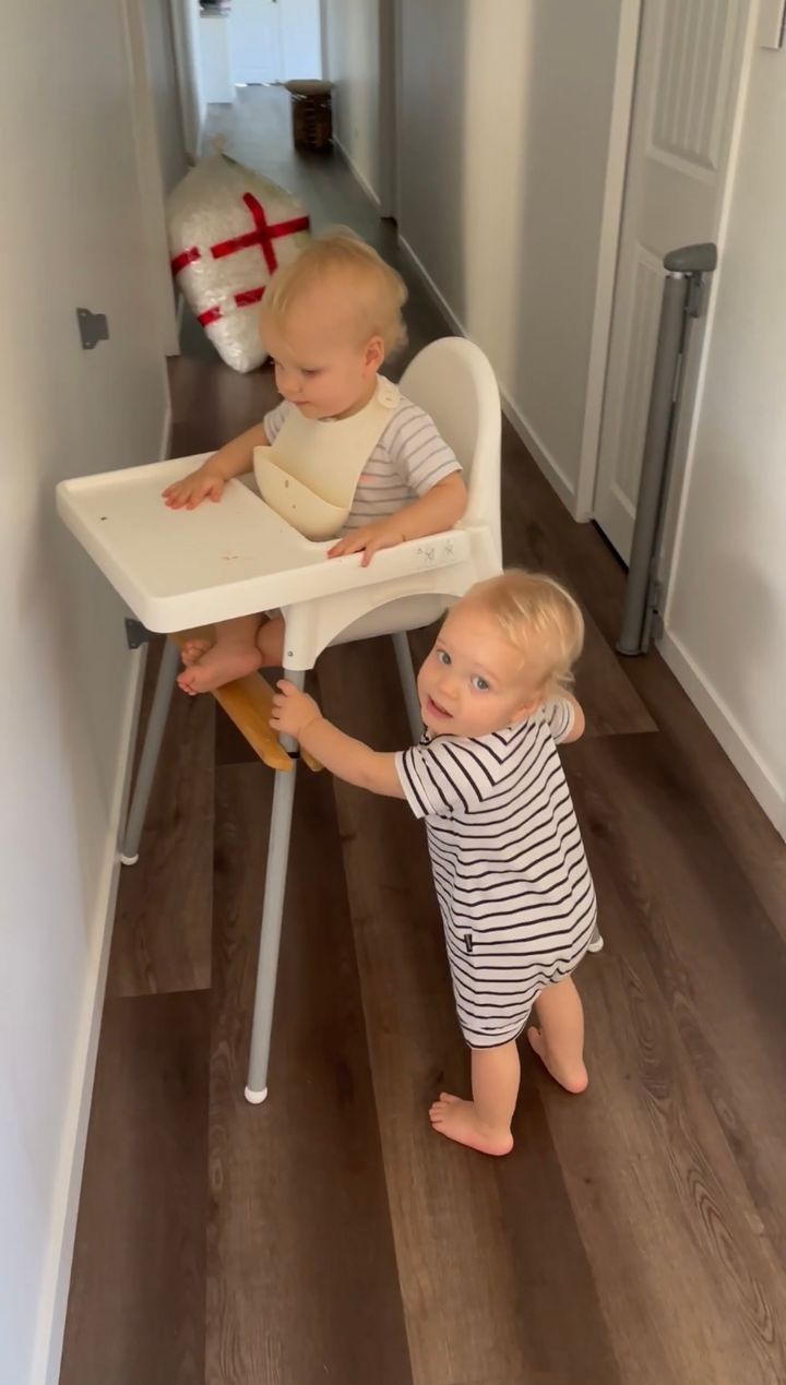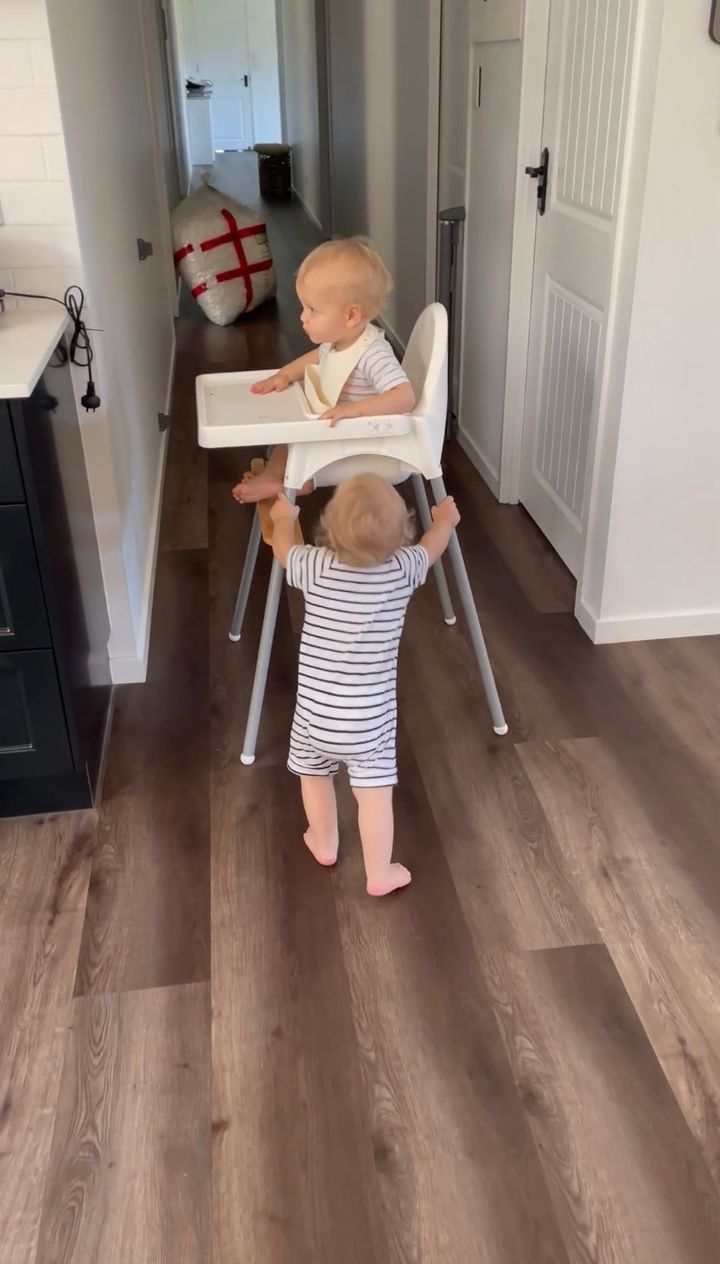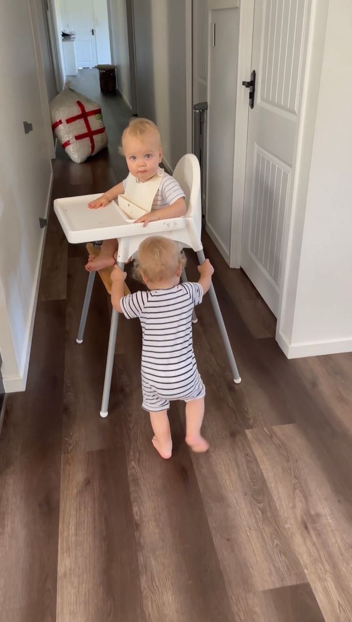 ハイチェアに座った双子の兄弟を椅子ごと押して遊んでいた赤ちゃん。