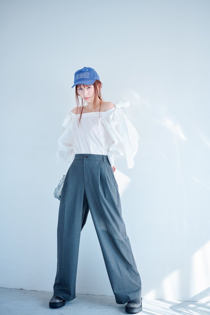 オフショルリボンブラウス¥17,600/フレイ アイディー スラックス¥5,590、ブーツ¥19,900/ザラ(ザラ カスタマーサービス) キャップ¥12,100/オーサムニーズ、バッグ¥11,000/ペタアンド ジェイン(ジャック・オブ・オール・トレーズ プレスルーム) フープピアス¥27,500/イー・エム