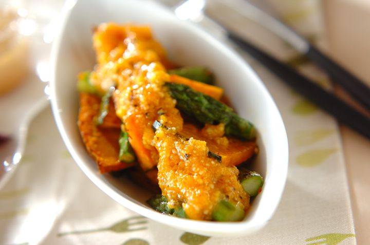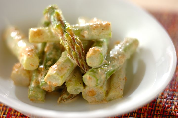 みずみずしいアスパラガスとごまマヨ衣がベストマッチ。茹でて和えるだけと簡単です。しょう油を少し加えるため、和食や日本酒とよく合います。お好みでワサビやユズコショウで辛味を足しても◎。