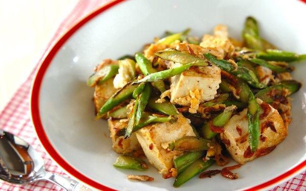 アスパラガスに桜エビとナンプラーの旨味を加え、ビールが進むおつまみにアレンジ。木綿豆腐のふわふわ食感とアスパラガスのシャキシャキ食感のコラボがたまりません。色合いもキレイで食欲をそそられますね。