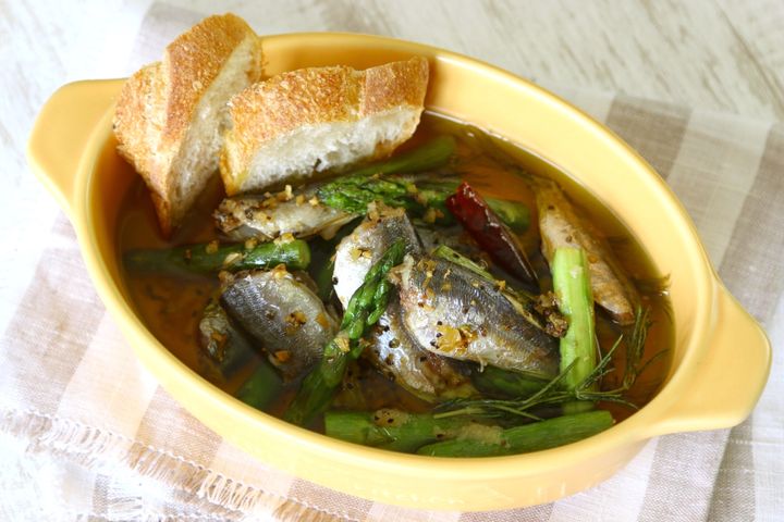 旬の小アジとアスパラガスでおしゃれな一品を作りましょう。爽やかな白ワインと合わせることで、素材の美味しさが一層引き立ちます。旨味が溶け出したオイルはぜひバゲットにつけて召し上がってくださいね。