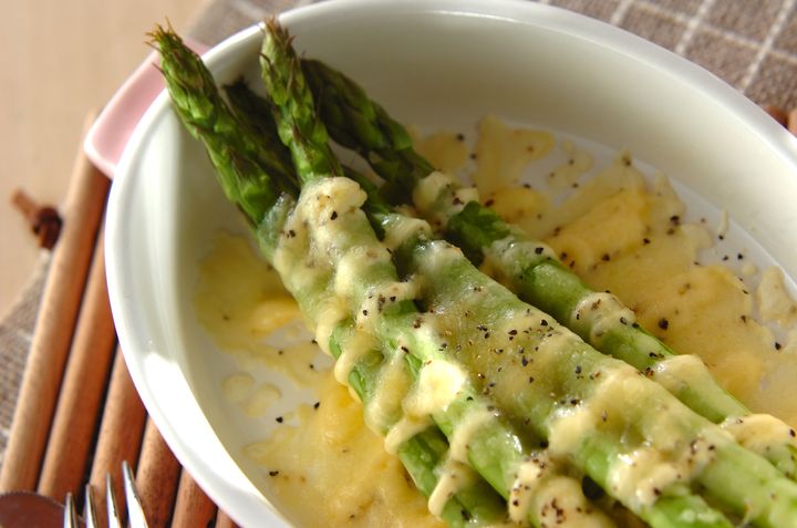 器に材料を入れたら、あとはトースターにお任せ! 甘くてジューシーなアスパラに、チーズとマヨネーズのコクが絶妙にマッチします。食べ応えがあるので、おつまみだけでなくおかずとしてもおすすめです。