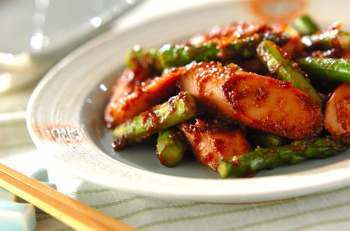 ・アスパラと魚肉ソーセージのみそバター炒め