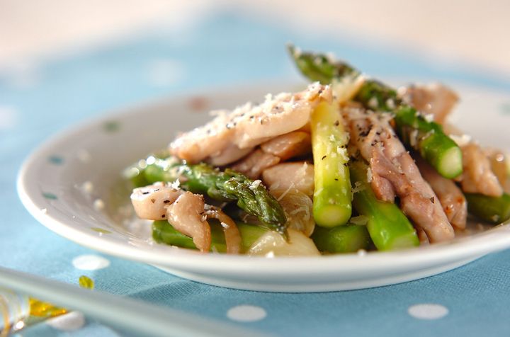 パルメザンチーズのコクとガーリックの風味が見事にマッチ。渋みのある赤ワインにおすすめです。シンプルな味つけですが、鶏肉の旨味やアスパラガスの甘みがしっかりと感じられます。パルメザンチーズは食べる直前にすりおろしてくださいね。