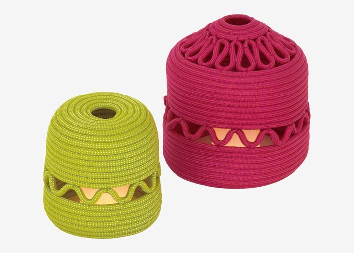 独自に開発したマテリアルを使った、色彩豊かなインテリアを提案するミラノ発の〈パオラレンティ〉。ブランドを代表する素材のロープコードを螺旋状に縫い付けたシェードがユニークなランタン「アガディル」は、隙間から優しい光が漏れる。耐久性があり、USB充電式なので屋外でも活躍。