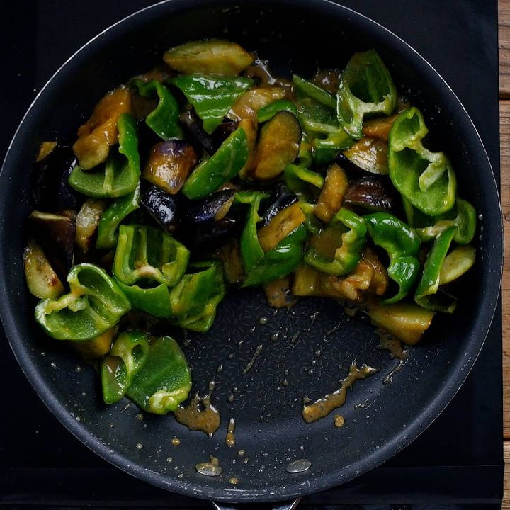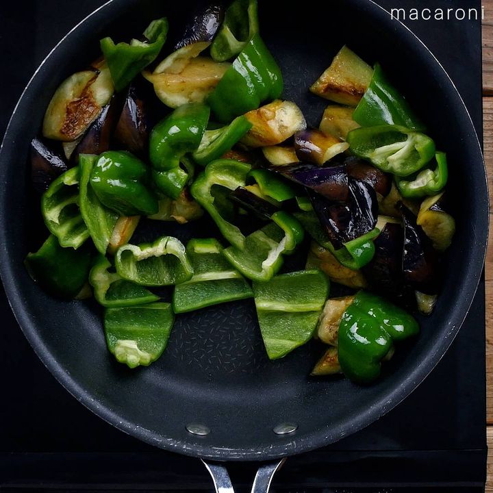 4: なすに焼き色がついたらピーマンを加えます。
