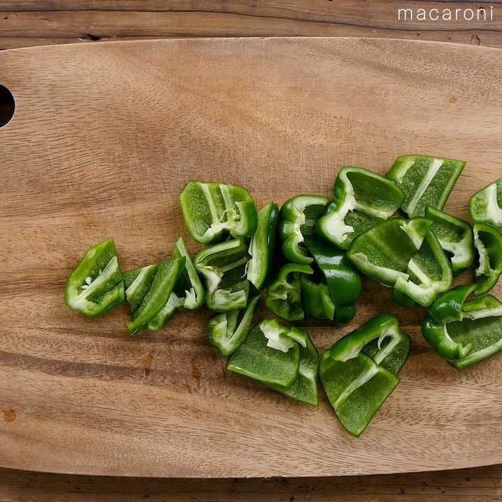 2: ピーマンはヘタと種を取って乱切りに、なすも乱切りにします。